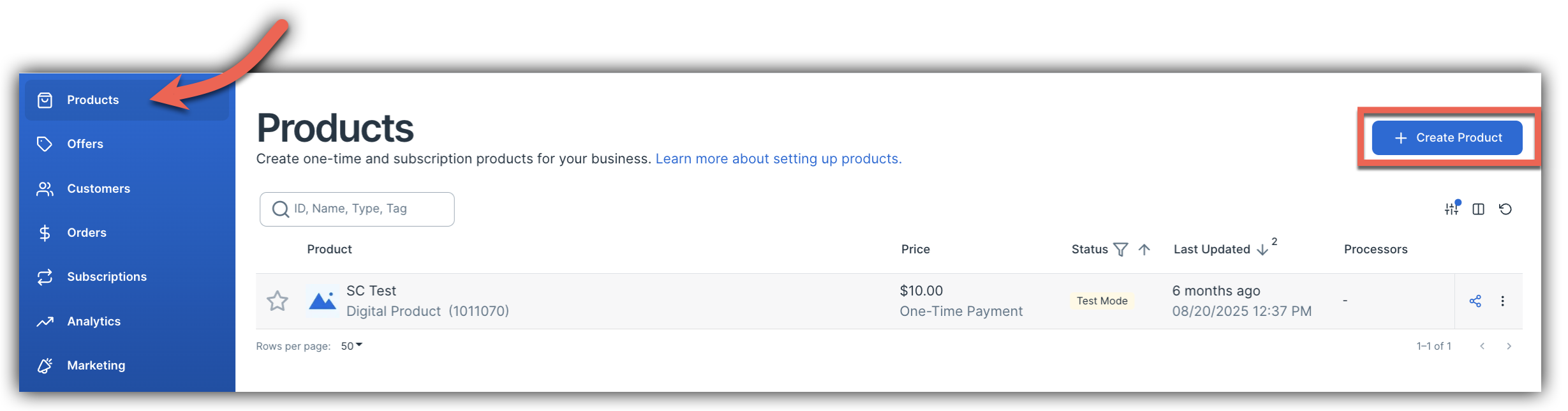 To create your first product, click the Products button in your left-hand sidebar. Then click the + New Product button in the top right corner of your screen: