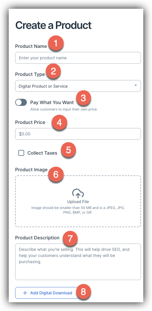 - Product Type (2): Select whether you want to sell a Digital Product or Service, Physical Product, Digital Subscription or Physical Subscription. These product types will have slightly different options that when creating the product. Continue reading to learn more about these product types and the options that appear when they are selected!