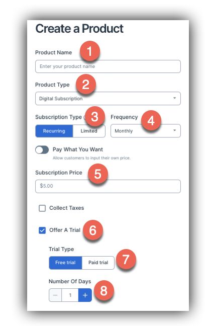 Note - The next 3 settings will only appear if the Trial Period is toggled on. - Free Trial or Paid Trial (7): This decides whether the trial you are offering will be free or paid. Free trials will allow customers to have the subscription for free for a bit of time before being charged, while paid trials will charge customers a fee for the trial period.