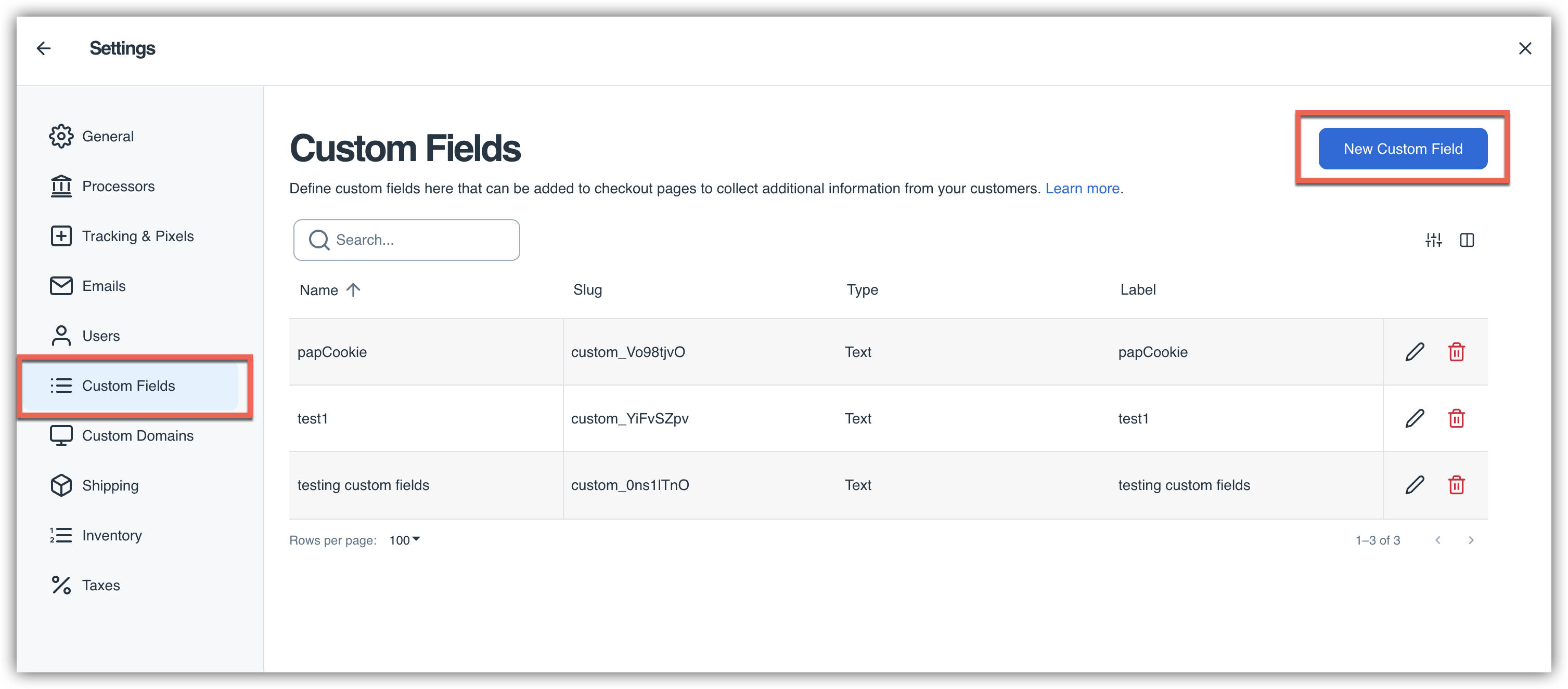 Once you are in your marketplace settings, click on the Custom Fields tab on the left side of the page. Here you can see any existing Custom Fields, and click New Custom Field to create a custom field.