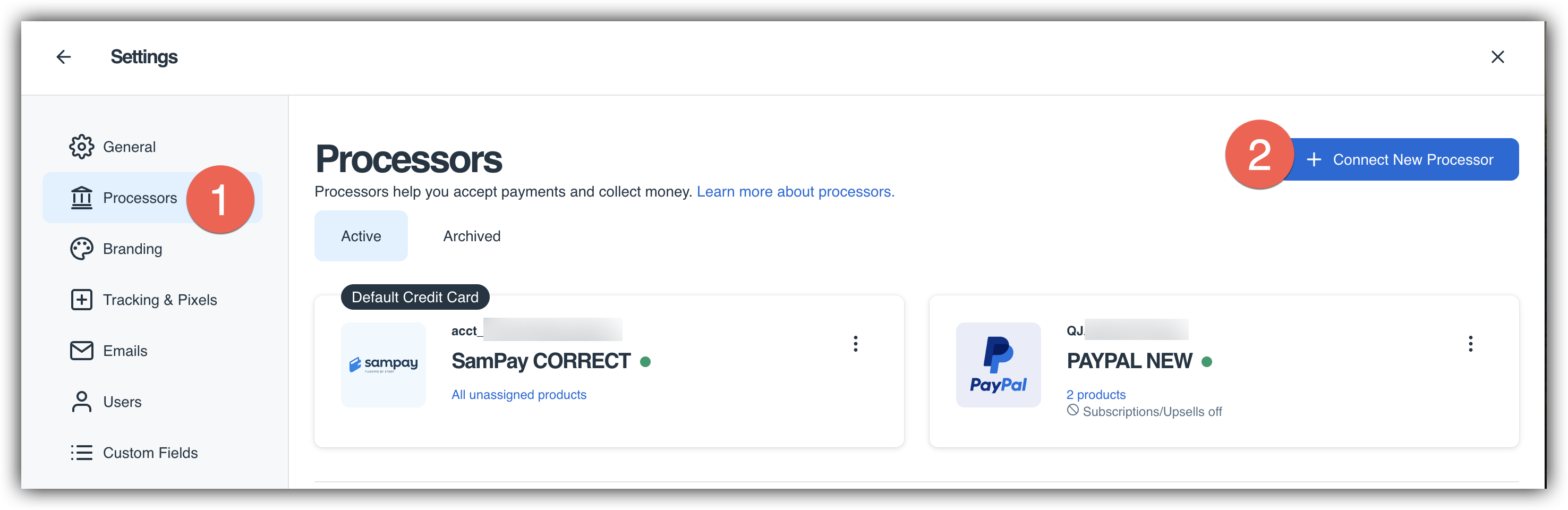 - Click into your Marketplace Settings by clicking the Settings tab in your left-hand marketplace navigation bar. Then click on Processors > + Connect New Processor.