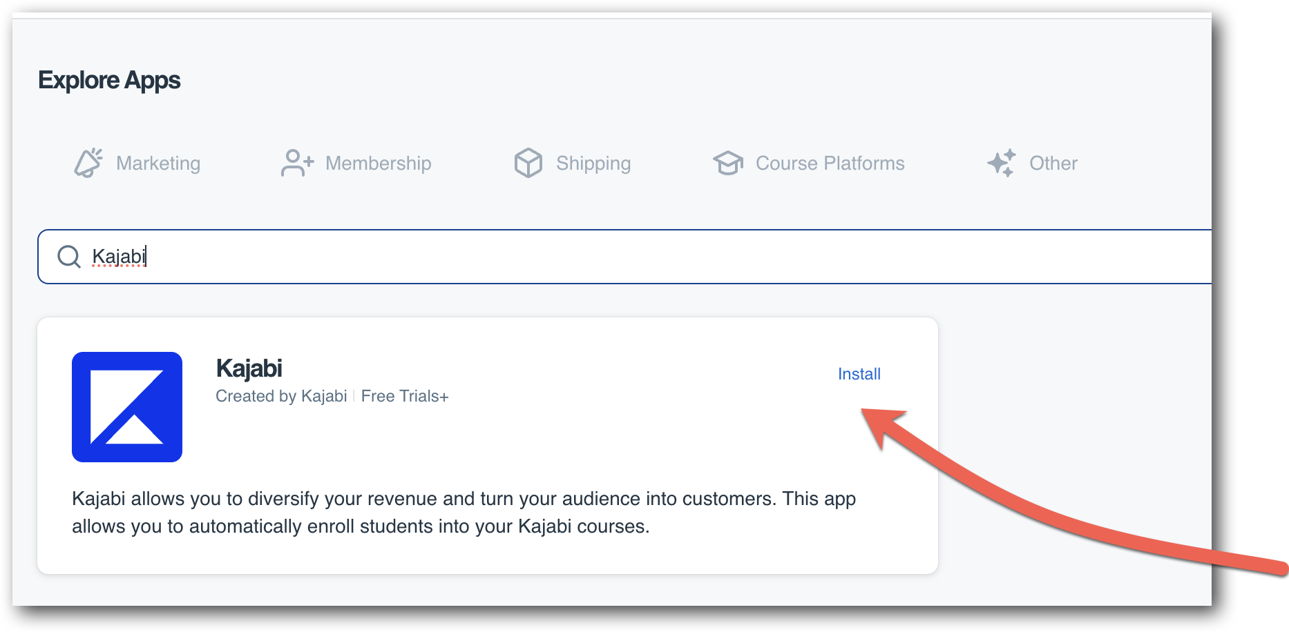 You can locate Kajabi by either clicking on the Membership tab or by using the search bar. Then click on Install.