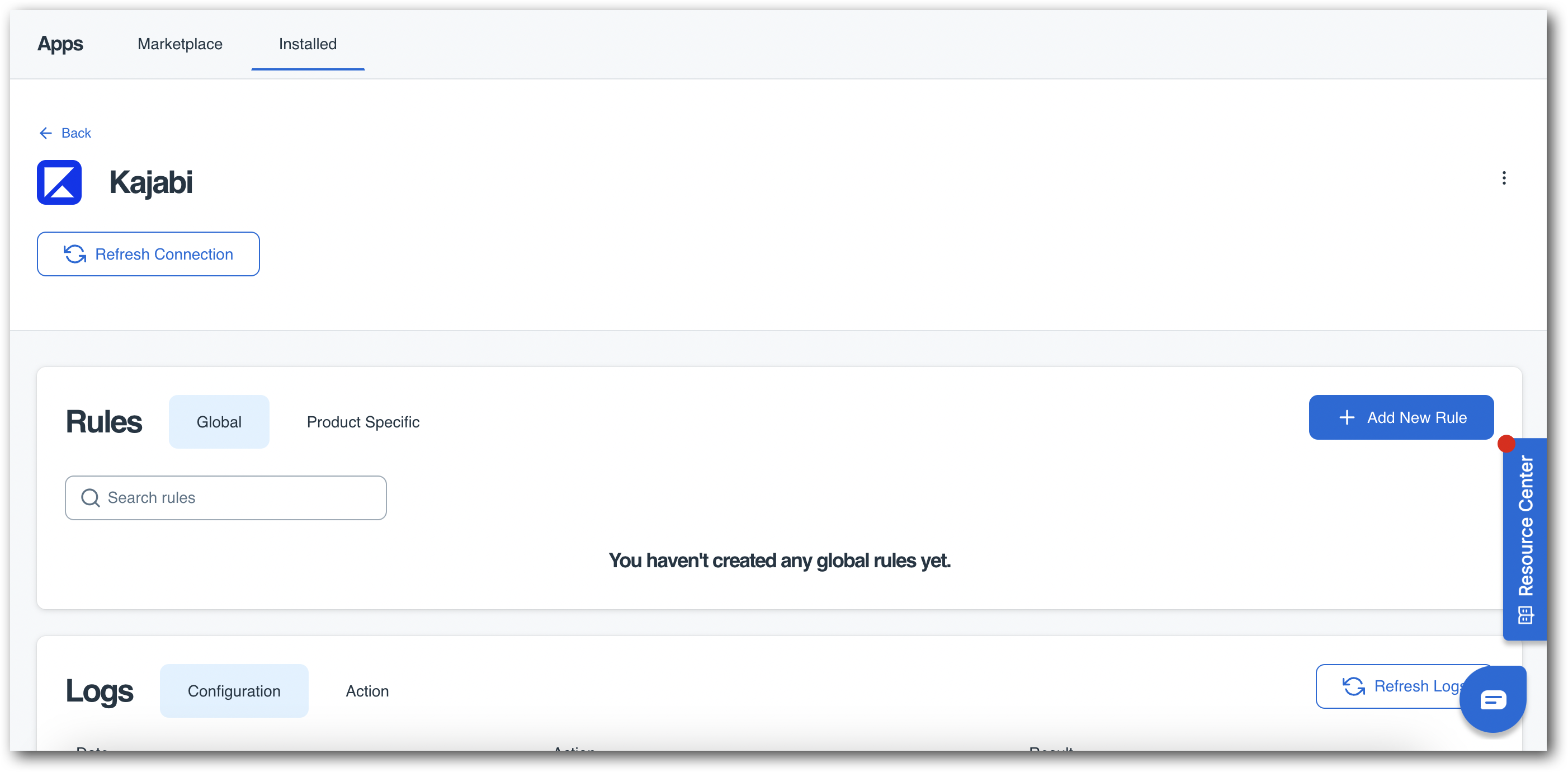 To create global rules that apply to all products, from inside your Installed Kajabi page, click on Add New Rule button in the Rules section.
