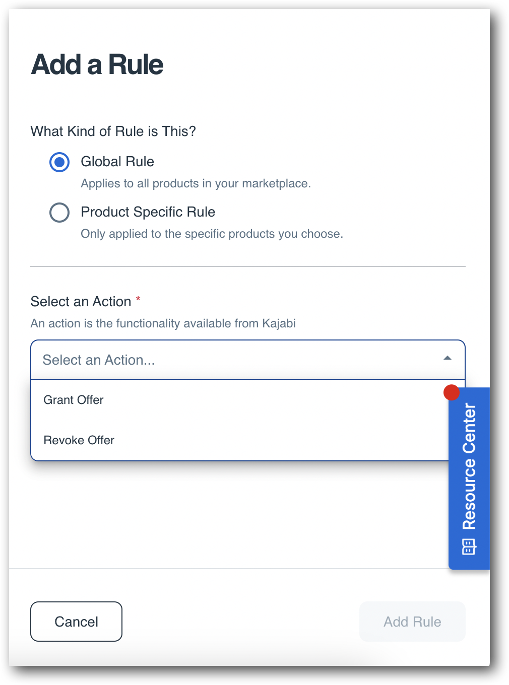 First, you’ll need to select either Global Rule or Product Specific Rule. For this example, we will select Global. Next, you'll select an action you want to perform on your application. An action is the functionality available in the app you are connected to. In the Add a Rule menu, select the app specific Action.