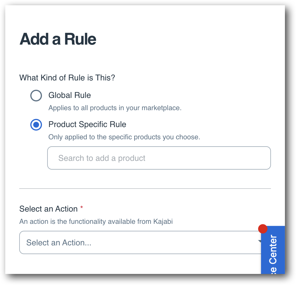 You can also create rules that automatically grant or revoke Kajabi offers for your customers for specific products, rather than having global rules that apply to all products! The process is very similar to the above, just click on the Product Specific Rule option after clicking on the Add New Rule button inside the Rules section.