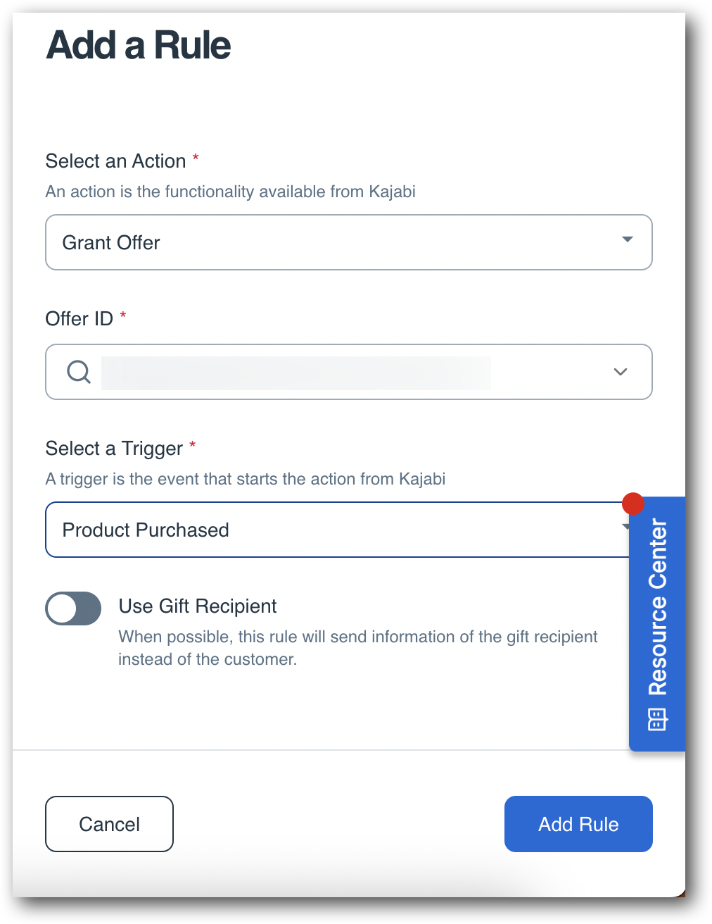 Once you have your Action selected, additional fields will appear to finalize your rule. For Kajabi you'll need to enter in the Offer ID that you would like to apply to that rule. You can click inside the Offer ID box to bring a drop down of all your available offers from Kajabi.
