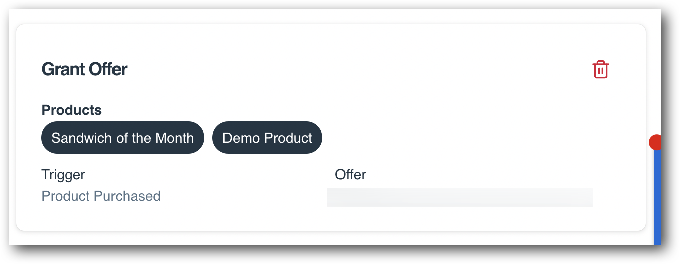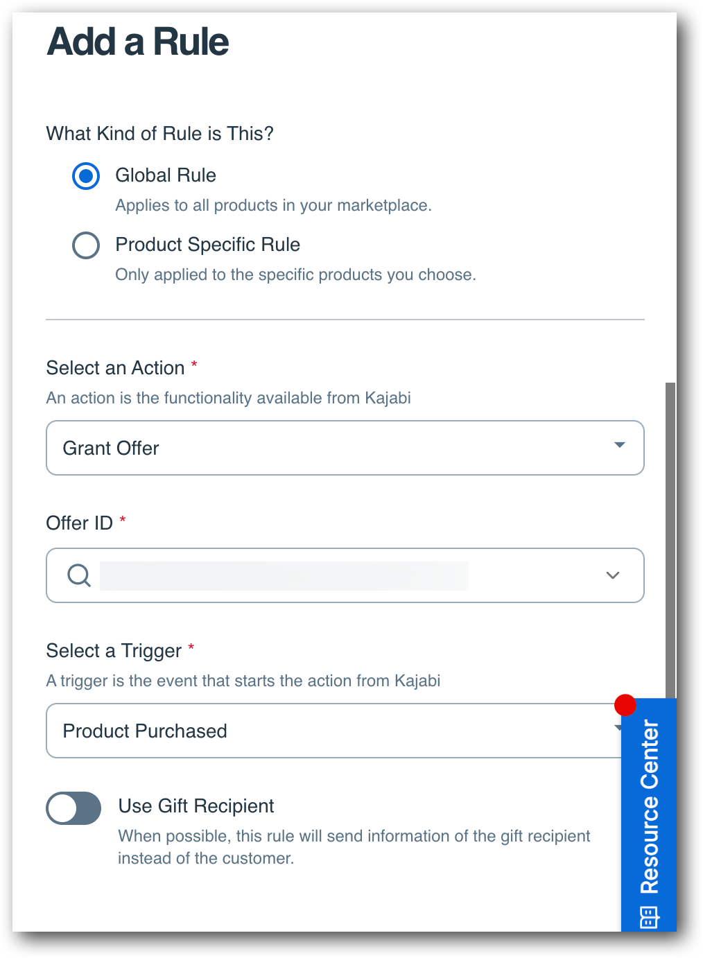From there, the setup is exactly the same as a global rule! You will choose an Action: Grant Offer or Revoke Offer. Then you will enter in the Offer ID and select a Trigger. In this example, we'll use the Product Purchased trigger as it's the most common.