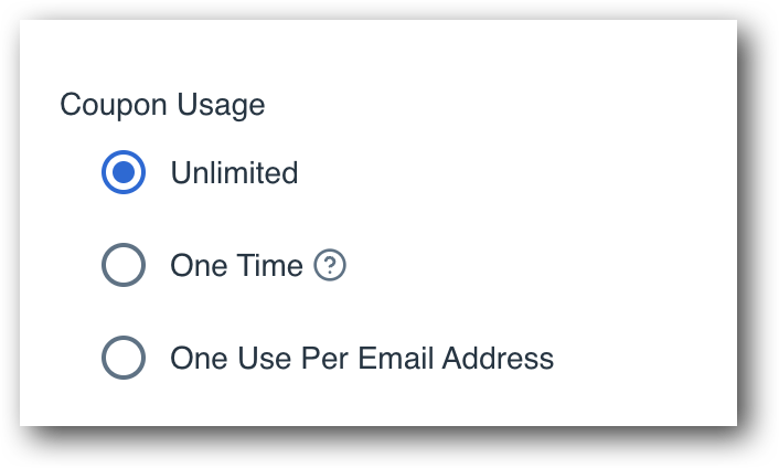 One Use Per Email Address - the One Use Per Email Address setting makes it so the coupon code only works for a unique email address once. This prevents a user with the same email address using the coupon code multiple times for the same product, but still lets users with different email address use the coupon code once. Note - If the coupon is applied to multiple products, customers will be able to purchase with the coupon using the same email on each product the coupon is applied to one time.