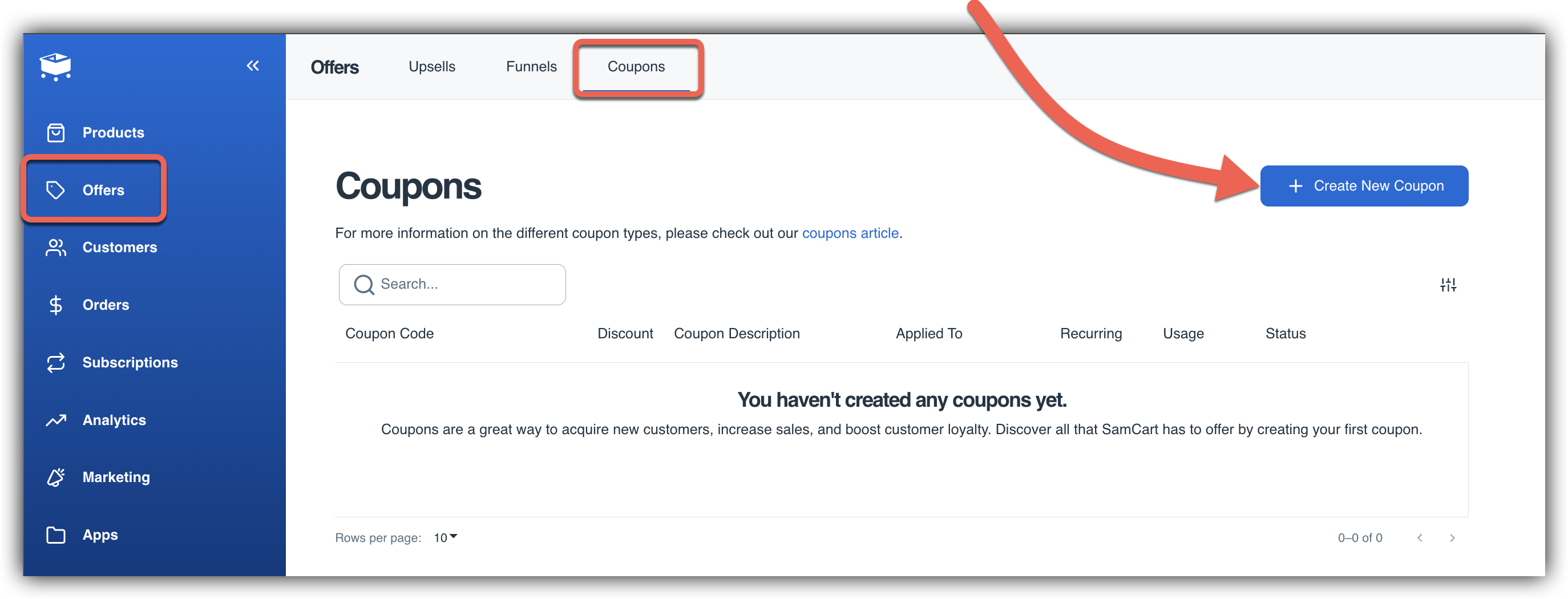 - From your Offers tab, select Coupons and then + Create New Coupon