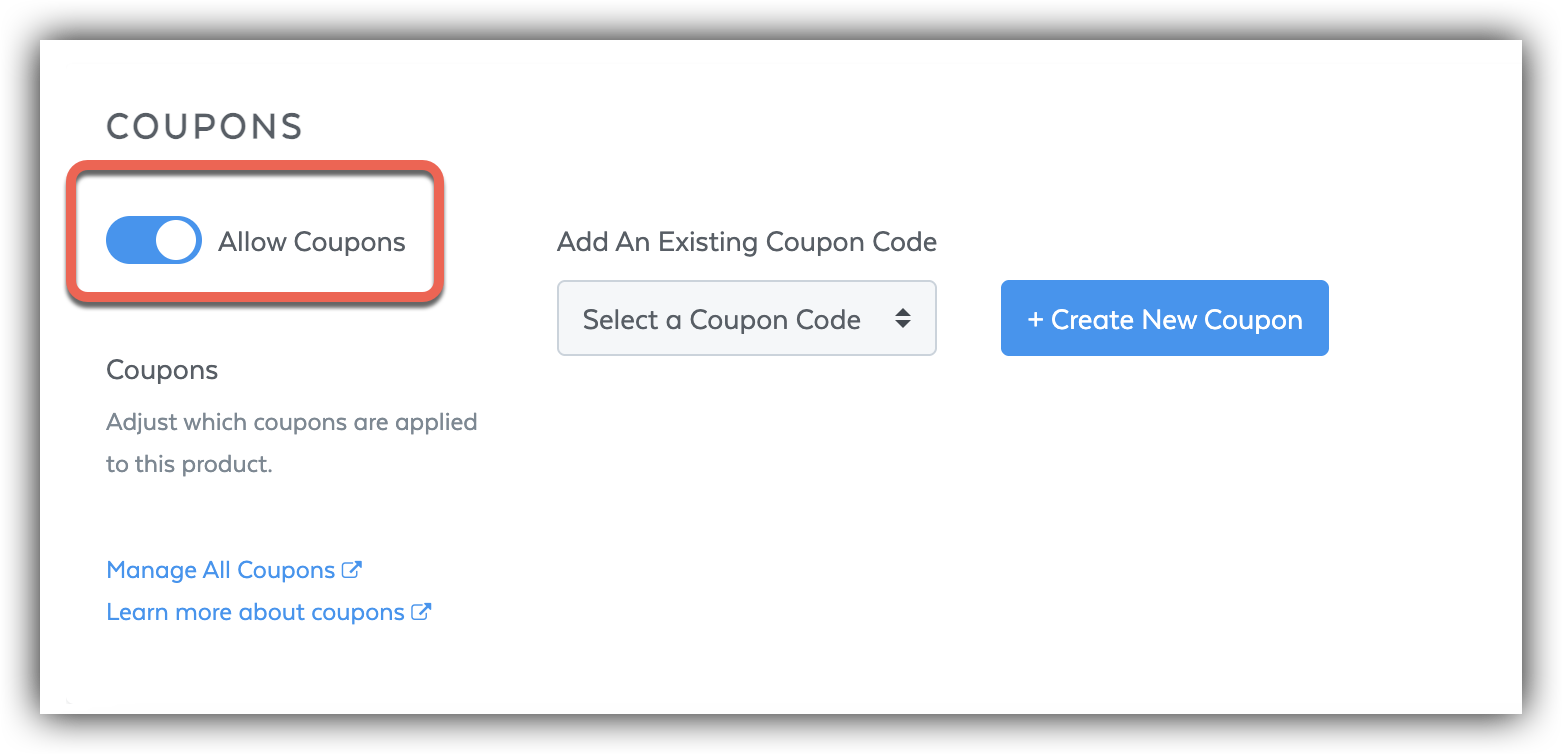 Scroll down to the Coupons section at the bottom of the page and switch the Allow Coupons slider to ON to allow coupons to be used on your product! Make sure to click Save Changes when you're done.