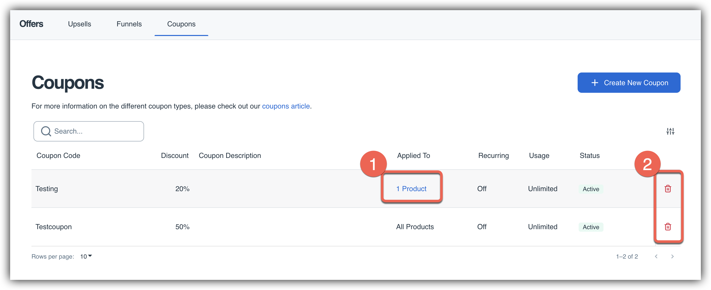 - Click the Trash icon to delete the coupon.