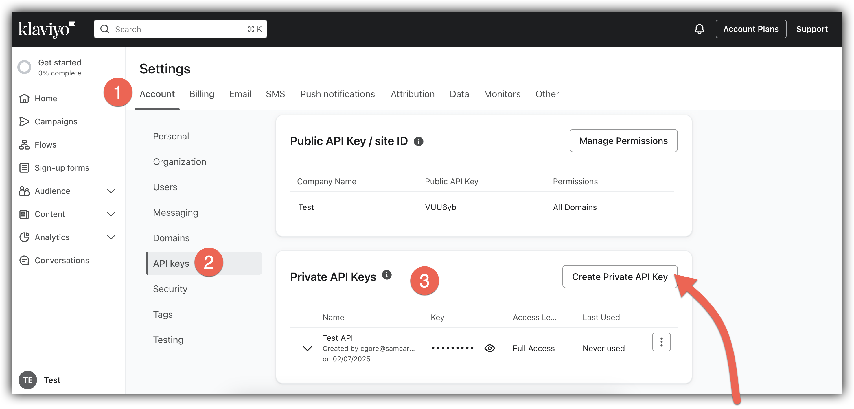 Make sure you are on the Account tab within your Kalviyo Settings, and click the API keys tab. Here you will see a couple different API keys, you will want to use your Private API Key.