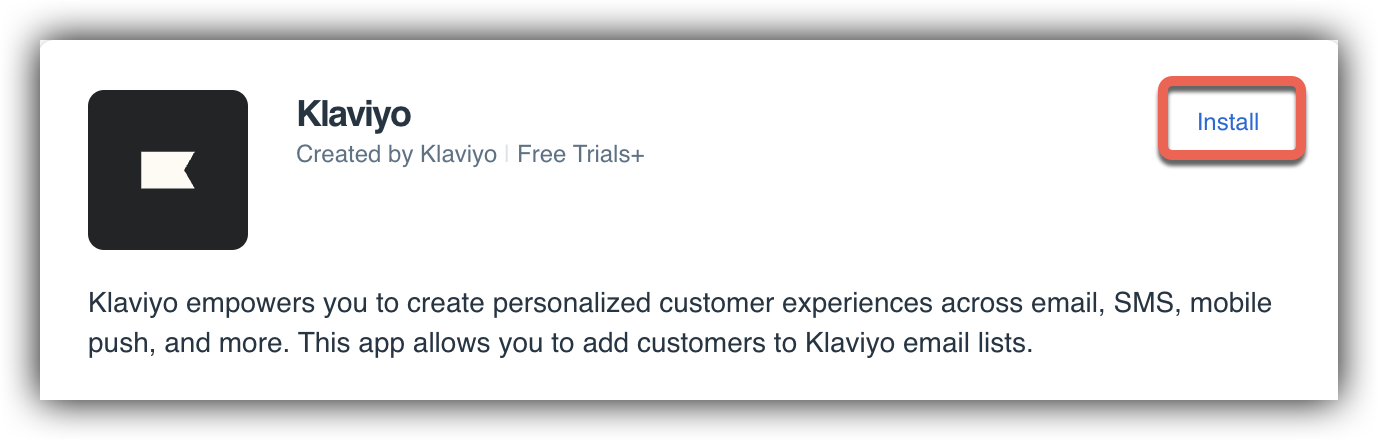 Once you are in the App Marketplace, you can search for the specific app you want to connect with! Search for Klaviyo and click the Install button: