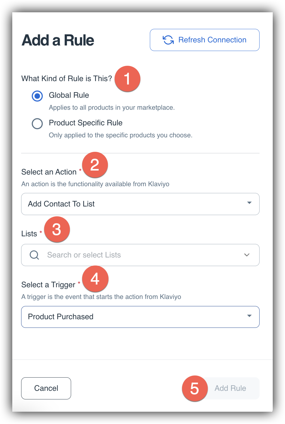 The final step in creating this rule is clicking the Add Rule (5) button. And we're done! Now you can see your newly created rule in the Klaviyo connection within the App Marketplace.