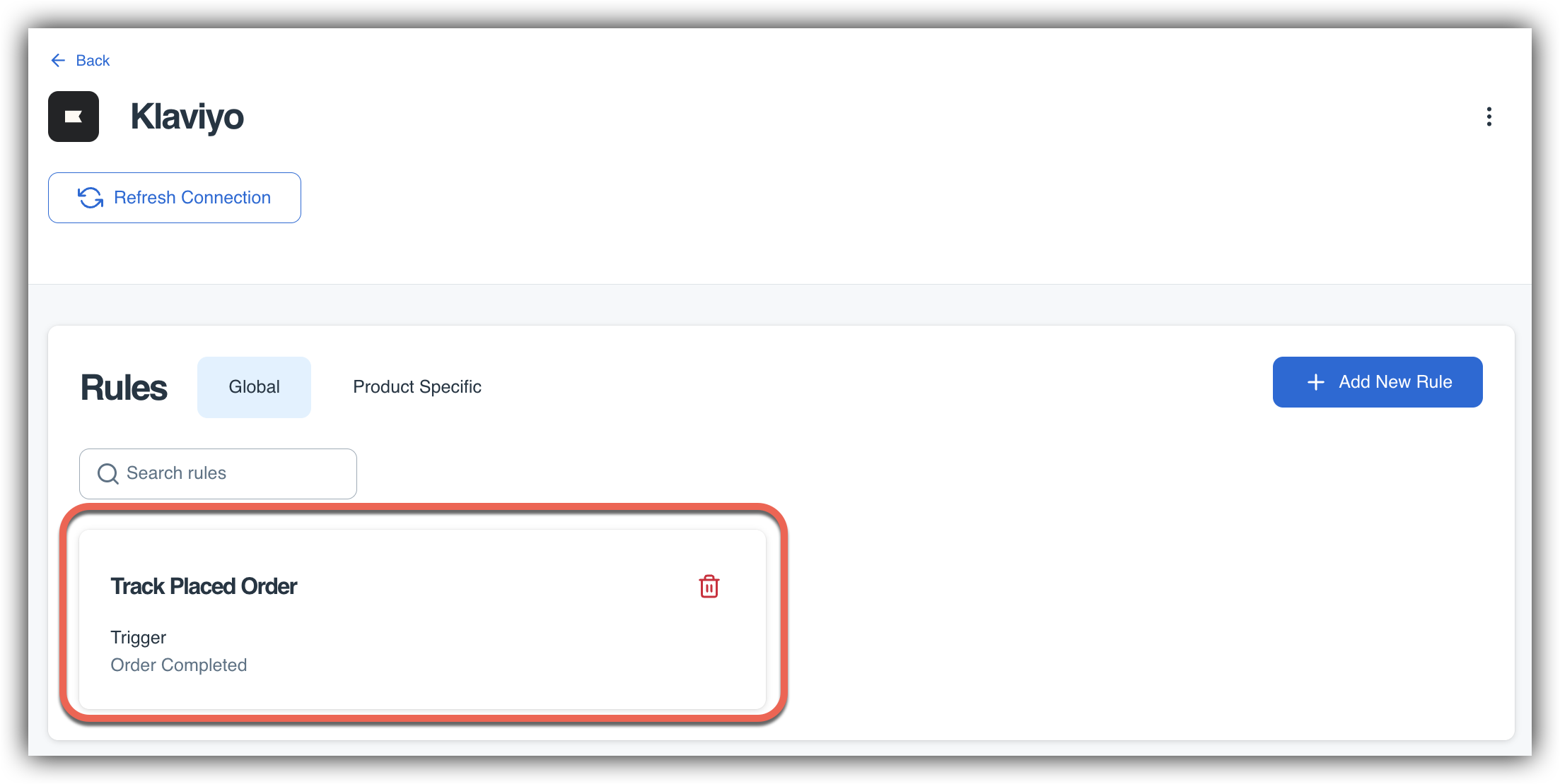 From within the Klaviyo connection in the App Marketplace, click on the + Add New Rule button.
