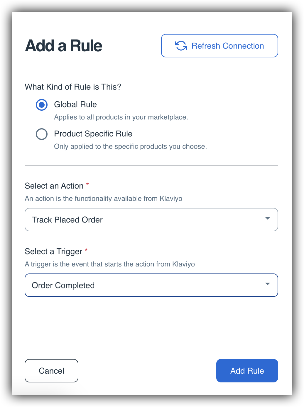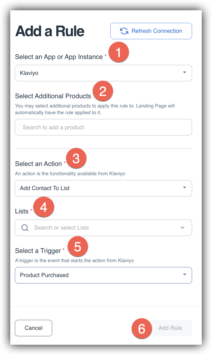 Once you've chosen the Action, you will need to select the List (3) in Klaviyo that you want the contact/subscriber to be added to or removed from as part of this rule. If you do not see the list you are looking for, click the Refresh Connection button in the top right corner of the window! Note - If you select the Track Placed Order action the List section will disappear as it is not necessary.