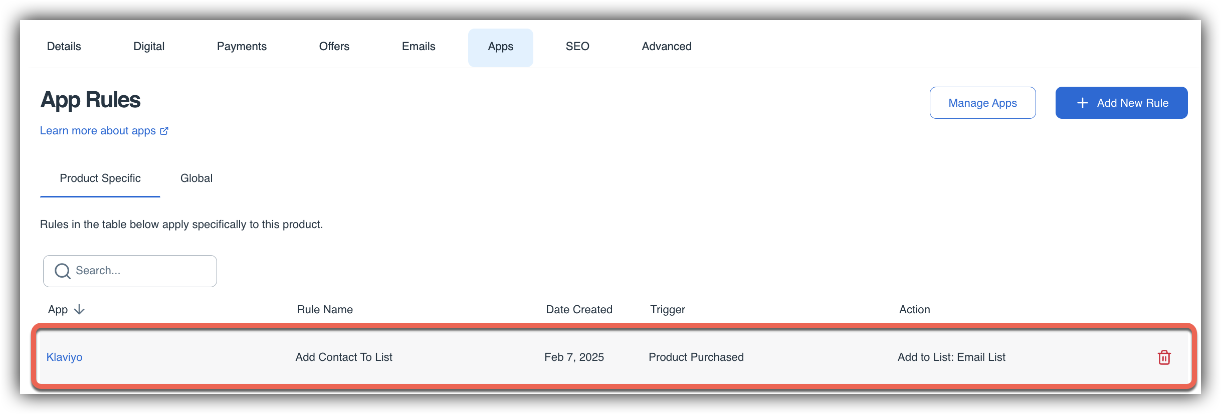 The final step in creating this rule is clicking the Add Rule (6) button. And we're done! Now you can see the rule you have created on the Apps tab of your product: