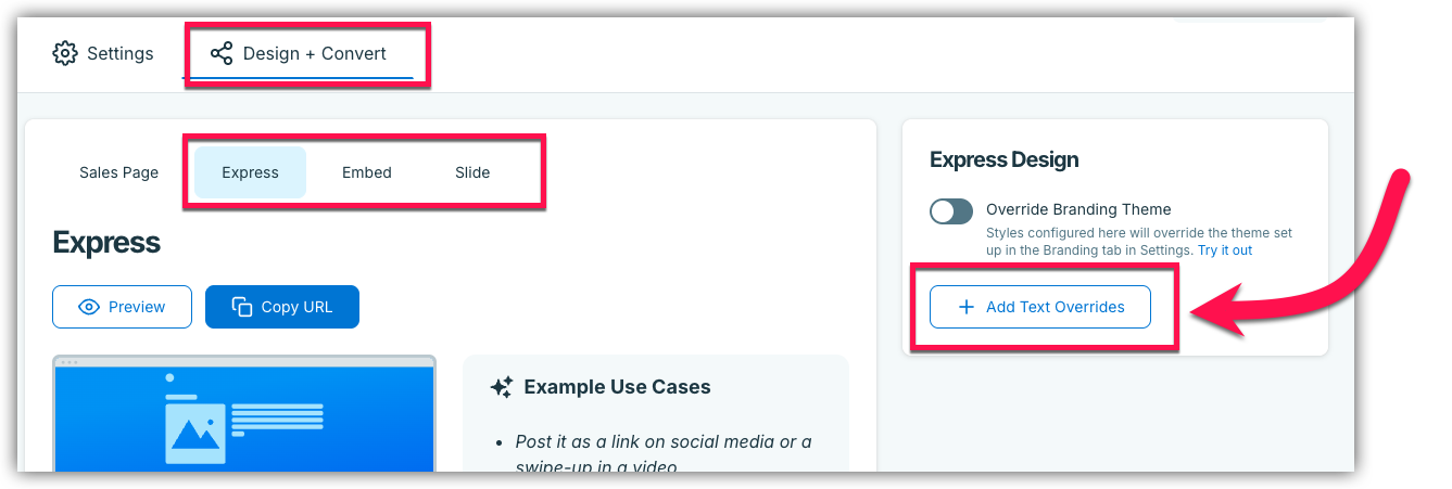 To do so, head over to the product that you would like to do this for. Click on the Design + Convert tab, and click on the tab (Express, Embed or Slide) that you would like to adjust the language for. In this example, we will be working from the Express tab. Click on the + Add Text Overrides button to get started:
