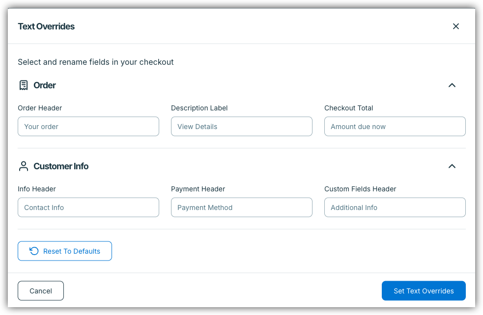 This will bring up a popup window for you to add your text overrides. You can see what the text currently says on the checkout form within the box, and you can change it to anything you'd like!