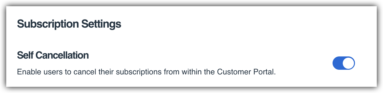 In the Subscription Settings section, you can choose to give your customers the option to cancel their recurring subscriptions within the Customer Portal. By default, the Self Cancellation feature will be set to Off. To allow customers the option to cancel recurring subscriptions, switch the toggle to On.