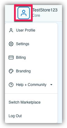 Clicking the icon in the top right corner of your marketplace (if you have a marketplace logo, this icon will be your logo) will bring up your Account Settings options. This is where you'll be able to manage your Account Settings and Billing information, as well as log out or switch marketplaces (if you have multiple marketplaces), and more.