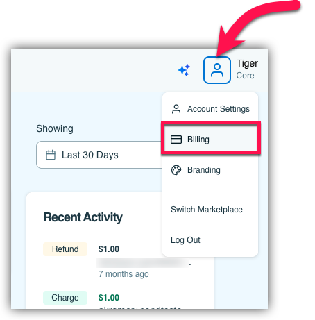 Your invoices are available directly within your Billing Page inside of your marketplace. To access your Billing Page, click on the blue icon in the top right corner of your marketplace and selecting Billing from the dropdown menu (note - if you have a marketplace logo added, you will see your marketplace logo instead of the blue icon).