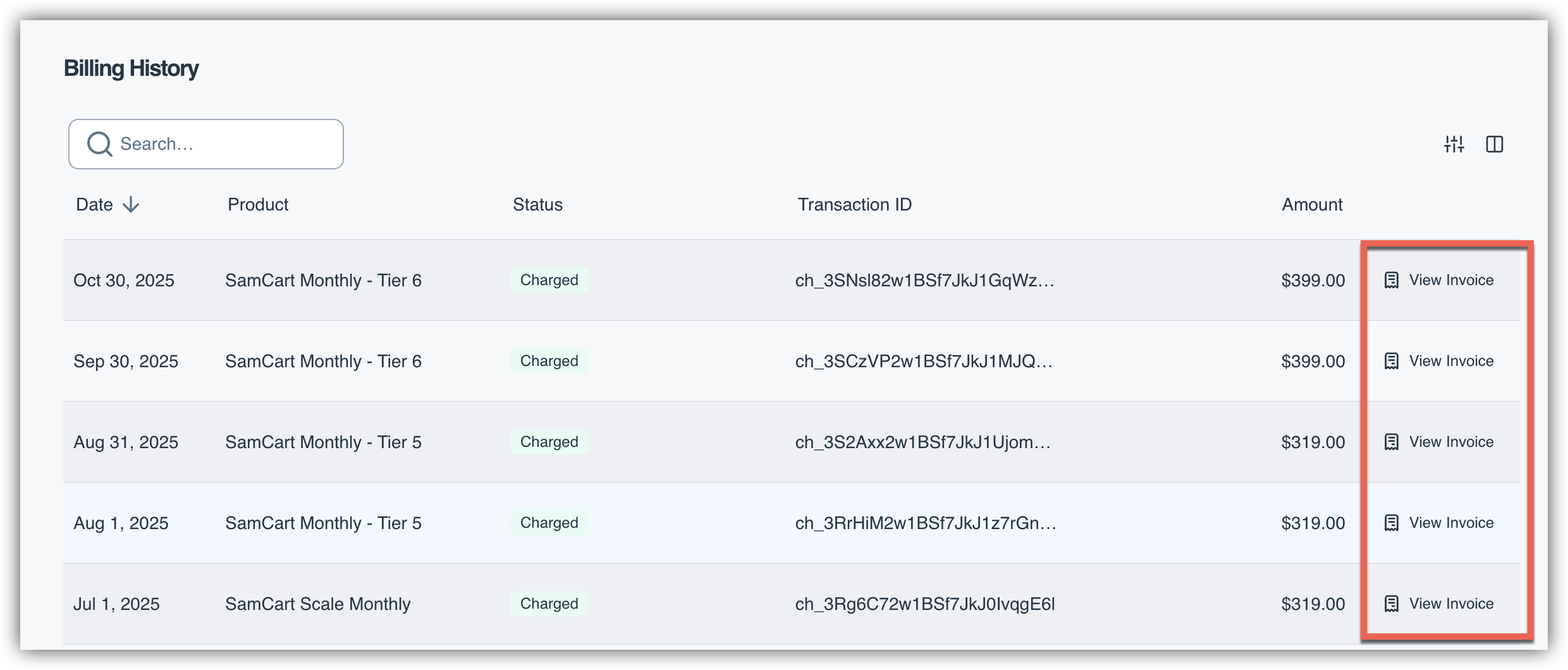 Under the Billing History section, you can see all your previous payments with some key information such as the date, status, transaction ID, etc. along with the invoice! You can view the specific invoice per payment period by clicking on the View Invoice button to the right of the subscription charge.