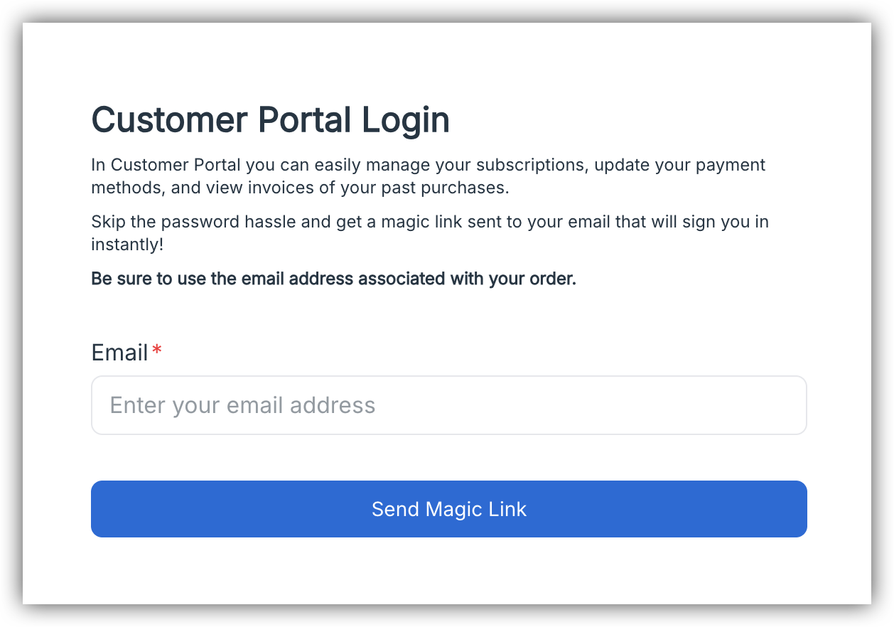 After you select the invoice, this will automatically open a new tab for you to enter your email and receive a magic link to access your Customer Portal. Your Customer Portal is where you will download your invoices.