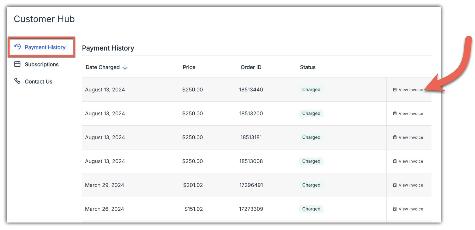 Once you are logged into your Customer Portal, click on the Payment History tab. Here you can see your payment history and click on the View Invoice button to view and download your invoices.