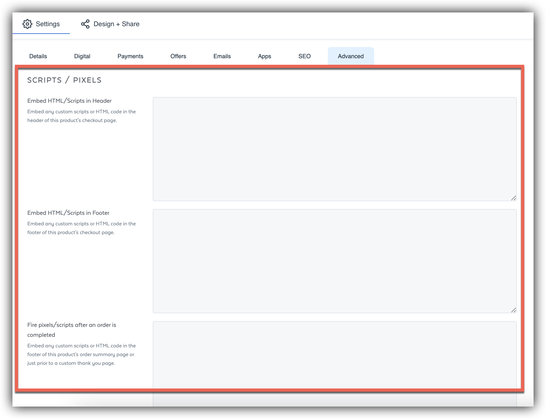 Secondly, check out your products' Advanced Settings tab. There are three similar boxes where you could embed custom scripts. Your GA tracking script should not be included in any of these three boxes if you have turned on the GA tracking integration outlined in this article. While you may have other scripts included in these boxes, there is no need for your GA tracking script to be included.