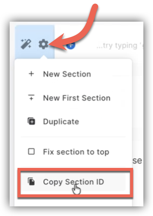 A: Adding a button to your checkout page that takes your customers directly to the checkout form embedded on the page is a great way to increase conversions! Of course, the easiest way to do this is simply link your express checkout form to the button. That said, if you would like a button to have more of a "Scroll to checkout" feature, that is possible as well! To do this, start by locating the Section ID for the section of your page that contains your checkout form. Go to the section of your page that contains the checkout form, click on the gear icon in the margins of the section on the left, and click Copy Section ID.