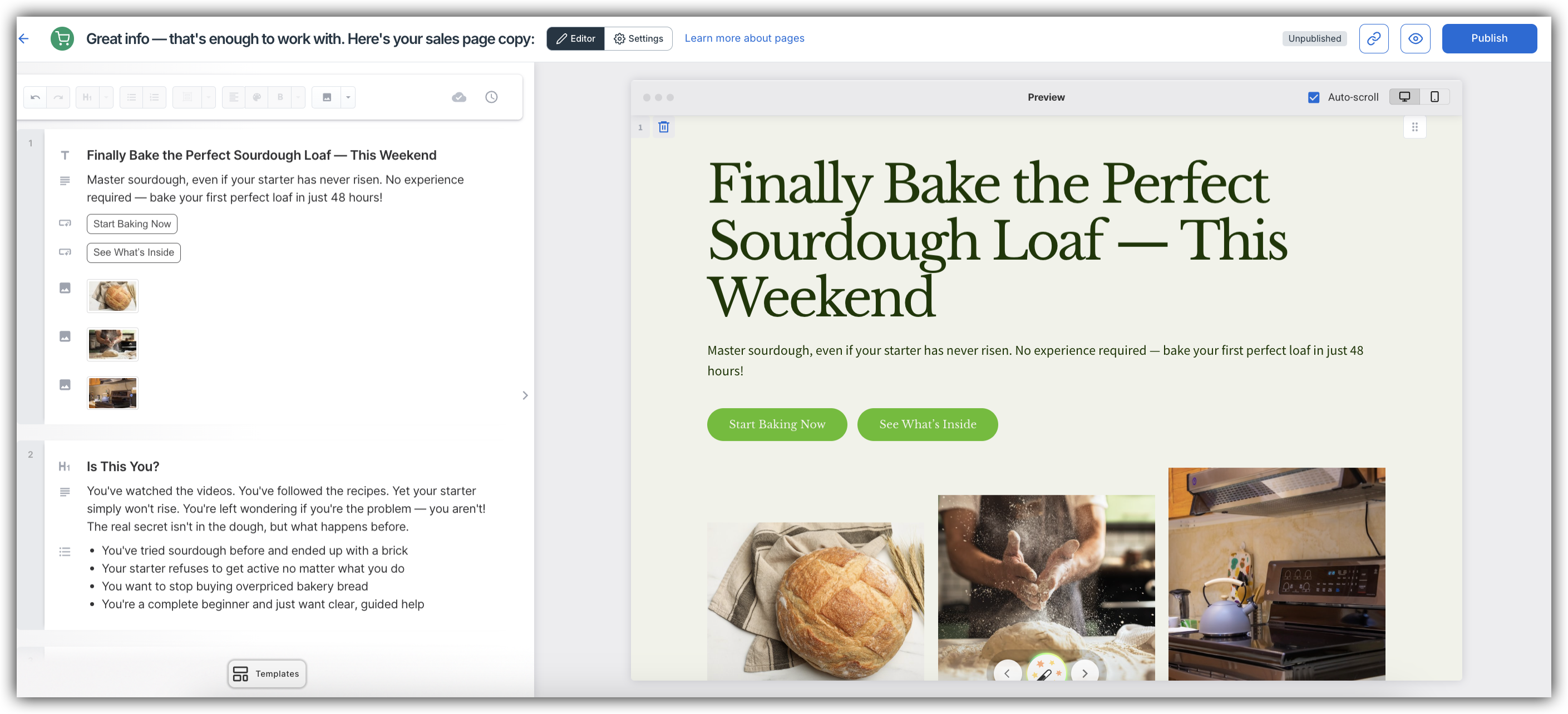 Here is a quick video that will also show you how to utilize the AI Assistant to create a sales page: