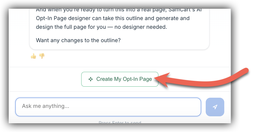 Once the AI Assistant has generated your copy, a Create My Opt-In button will appear below the response. Click it to go straight to the Sites page builder with your copy pre-loaded in the AI prompt field — no copying or pasting required.