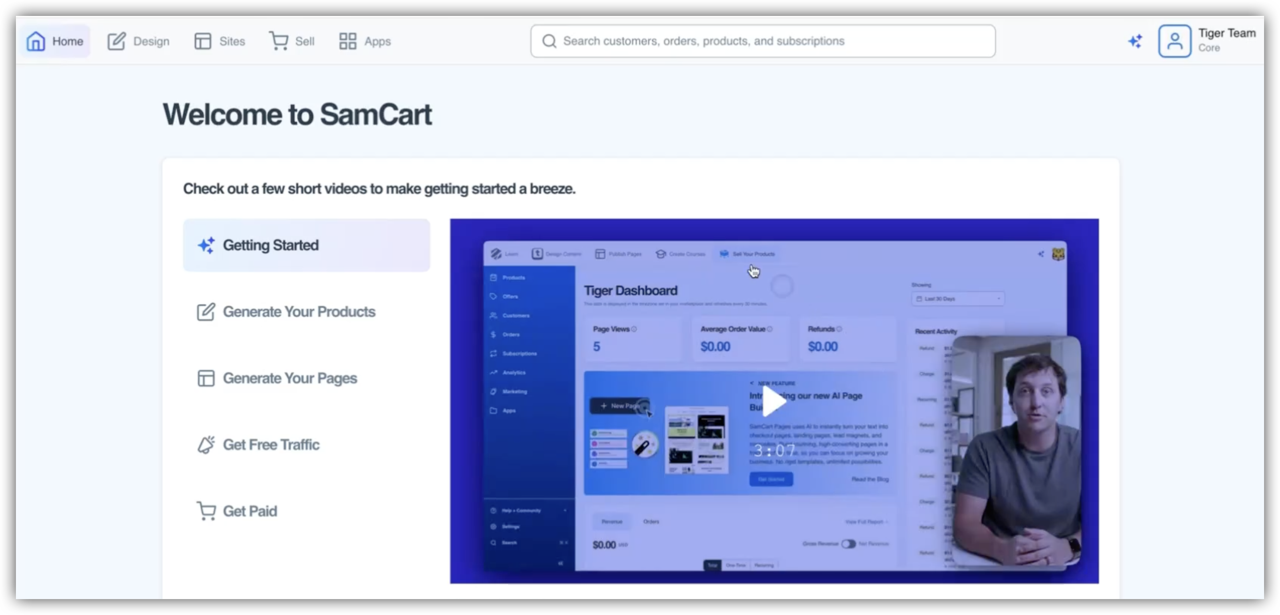 This Home tab is the very first page you will see when you log in to your marketplace (this is the page in the screenshot shown above). It will contain several videos to help your get started, create your products and checkout pages, and more! We highly recommend checking out each of these videos when starting out, this will help you understand where you should begin and how to use your new tools. If you ever want to you can get back to the Welcome to SamCart homepage, just click that Home tab!