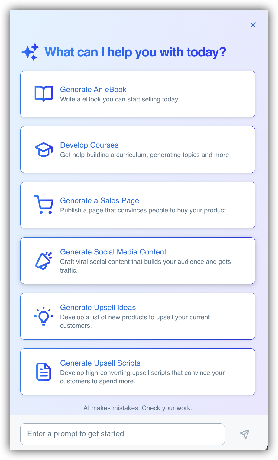 Clicking the Sparkle icon will bring up the AI Assistant popup on the right side of the screen. Here you can instantly use our AI bots to help you generate an ebook, generate sales page or upsell copy, and more! Just click on the bot you want to use and get started creating AI generated content in an instant.