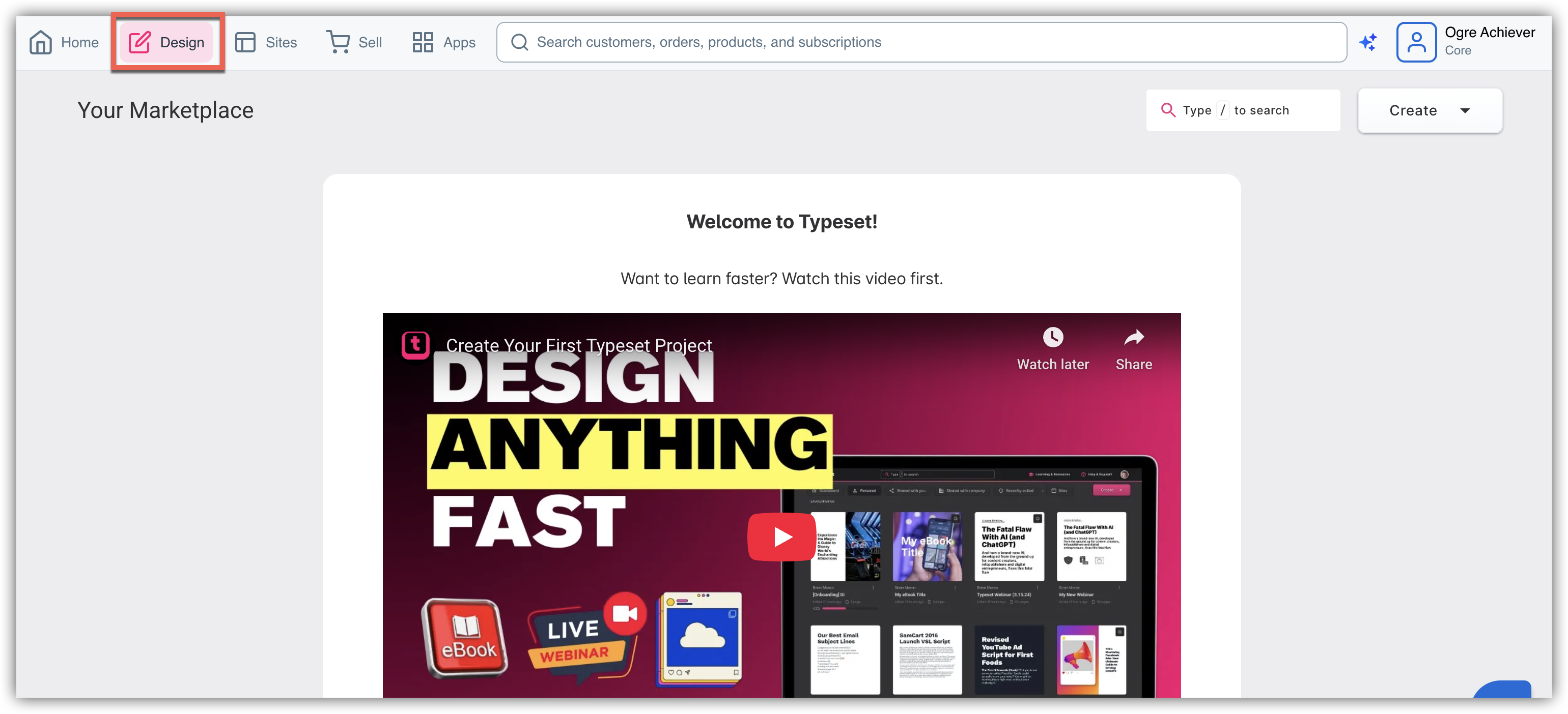 The Design tab will take you to your Typeset homepage! Typeset is our AI Design Platform that helps you (or your team) create amazing digital content 10X faster. Just write your content (or have our AI do it for you), let our AI adjust/refine your content, then quickly and easily export than content into a ready to go ebook, slide deck, etc. It's that simple! Just click the Create button in the top right corner to get started.