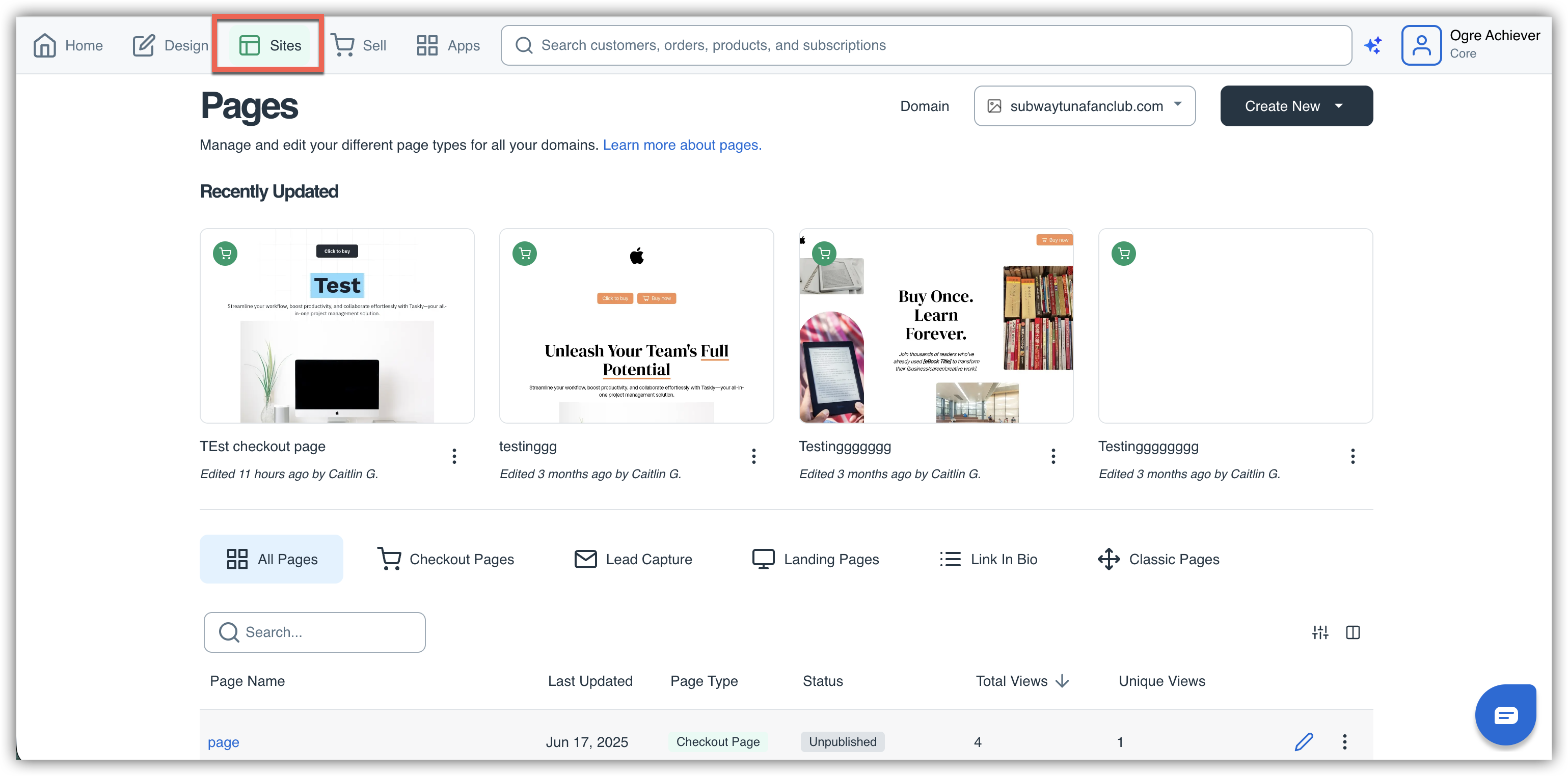 The Sites tab will take you to our Page builder. Here, you can start building your landing pages, checkout pages, link-in-bio pages and lead capture pages! You can create your own page from scratch, copy/paste content from the AI assistant, or use our AI technology built into the Pages feature to start creating any kind of page. You can create a new page by clicking the Create New button, and see any pages that you've created in the past at the bottom of the page.