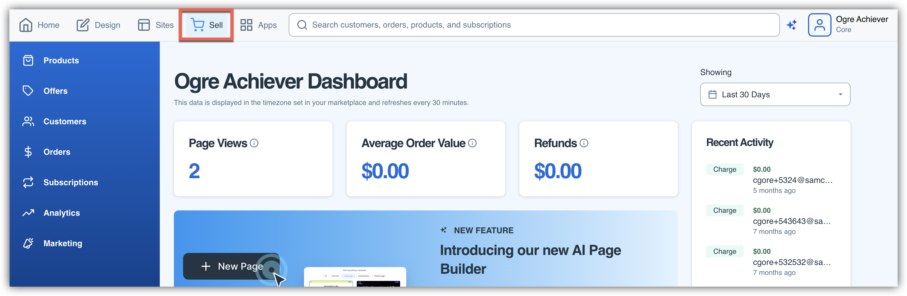 Click on the Sell tab to start creating products to sell, and to view information on any sales that you've made! This tab is where your SamCart marketplace will exist, and you will manage most aspects of your business. This is where you will create products, upsells, order bumps, coupons, etc., as well as manage all customer orders and subscriptions and view all customer/order data. This is also where you can manage more advanced features such as your Affiliate Center, Cart Abandonment, Subscription Saver, and more once you've started selling and are ready to utilize these features!