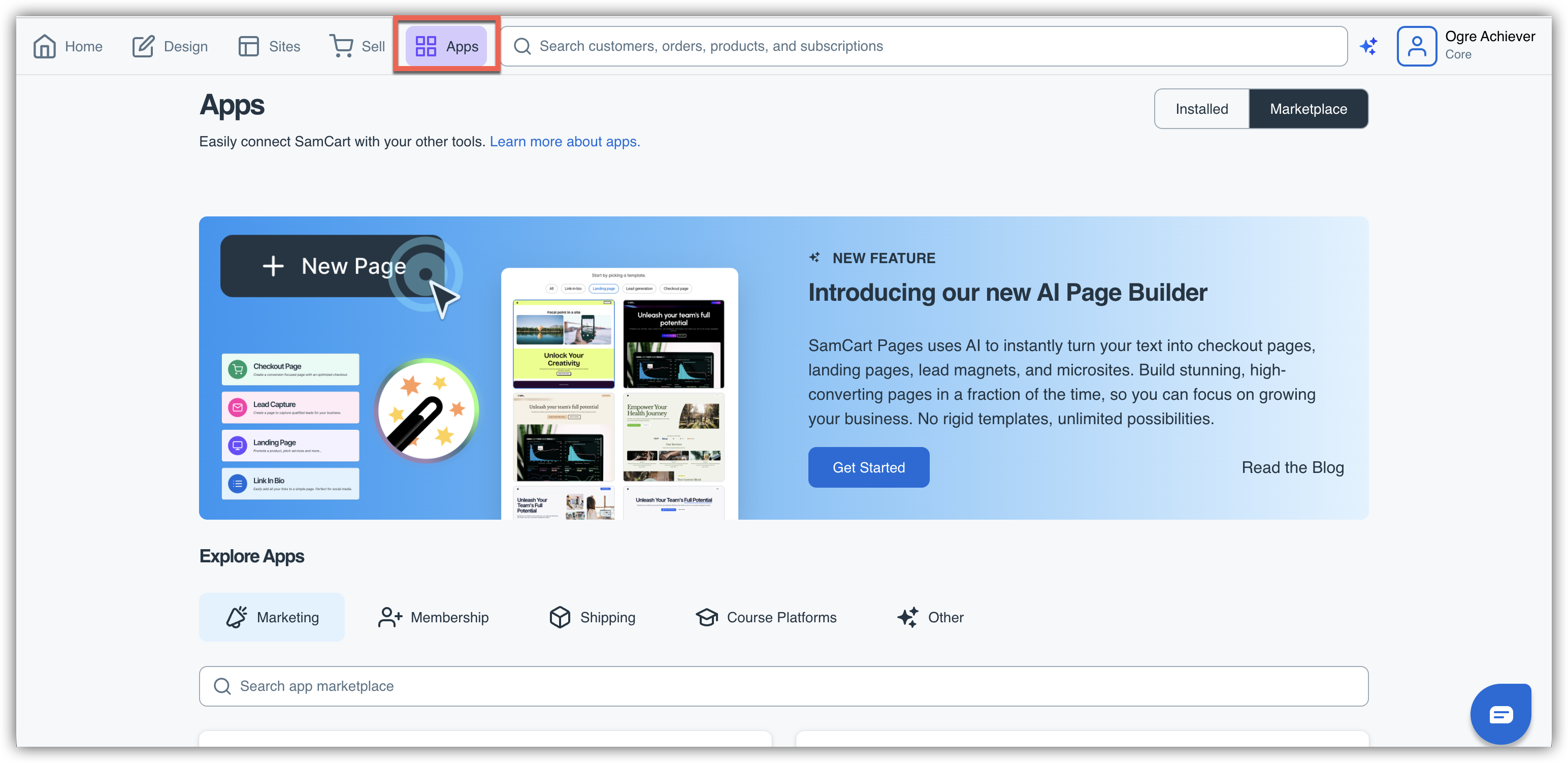 The Apps tab will give you access to the App Marketplace - this is where you can connect SamCart to each of your favorite tools that you're using outside of SamCart. You can use the App Marketplace to connect to email marketing tools, community/membership tools, and everything from cart abandonment to delivering your products!
