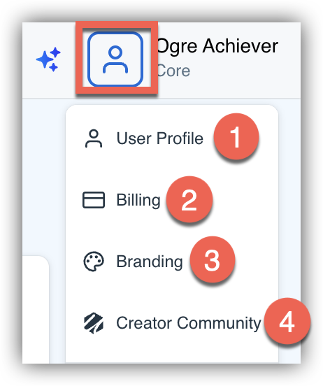 • User Profile (1) - This will take you to your account settings - check out our User Profile Settings support article to learn more.