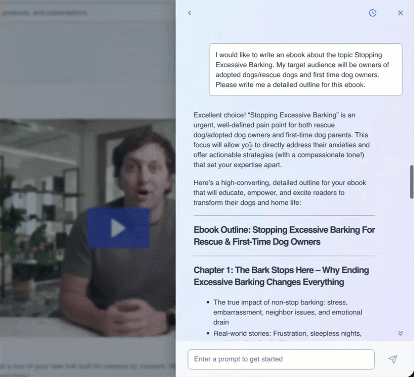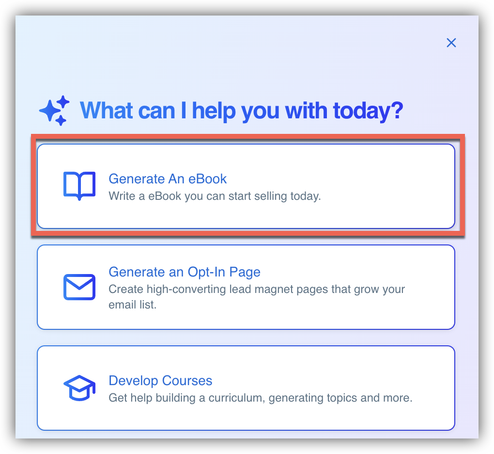 The AI eBook Assistant is available to help you brainstorm and create content. Simply describe what you're an expert in or what your audience needs, and the assistant will provide tailored suggestions!