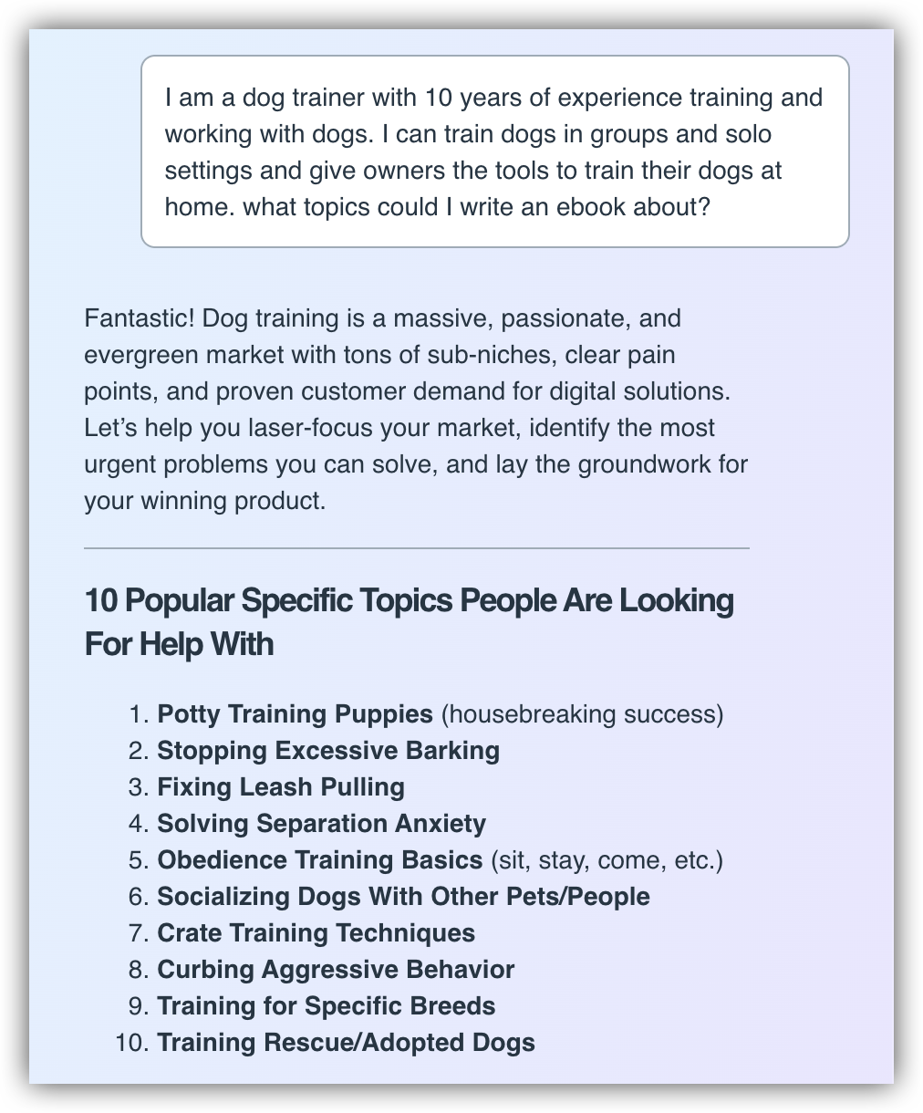 Tell the assistant about your area of expertise (e.g., "I'm a fitness coach specializing in busy professionals" or "I teach small businesses how to use social media"). The AI will suggest multiple eBook topics that could resonate with your audience.