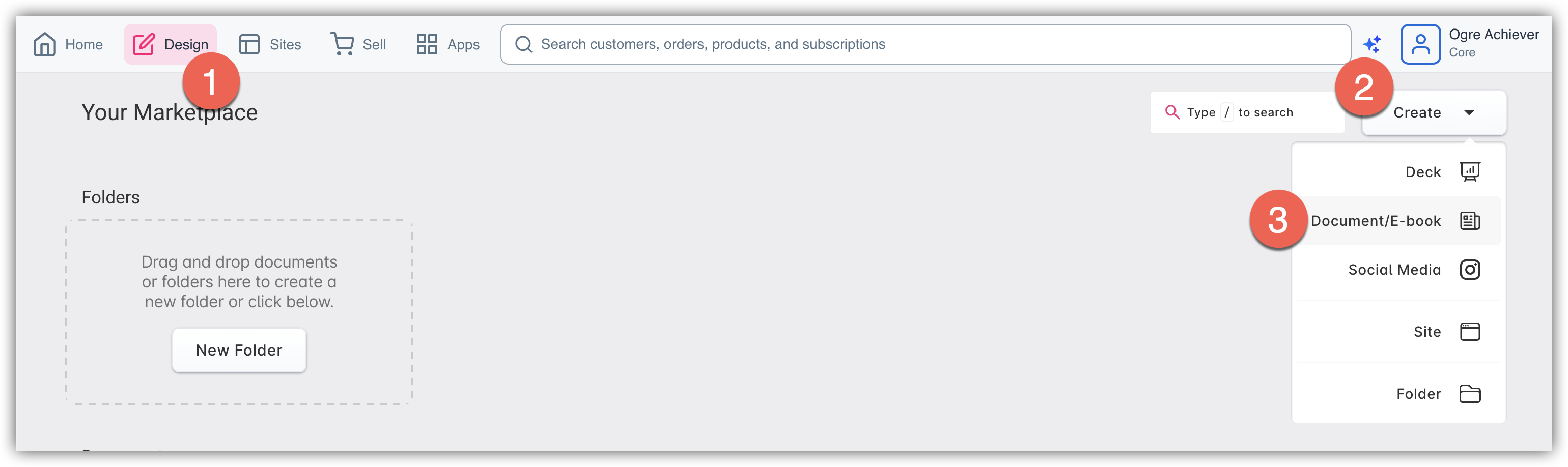 Navigate to the Design tab (1). Once you are on your Design tab, click on the Create button (2) and select Document/E-book (3).