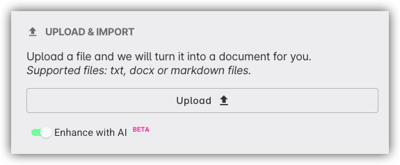 • Upload & Import: Click Upload and select your .txt, .docx or markdown file from your computer.
