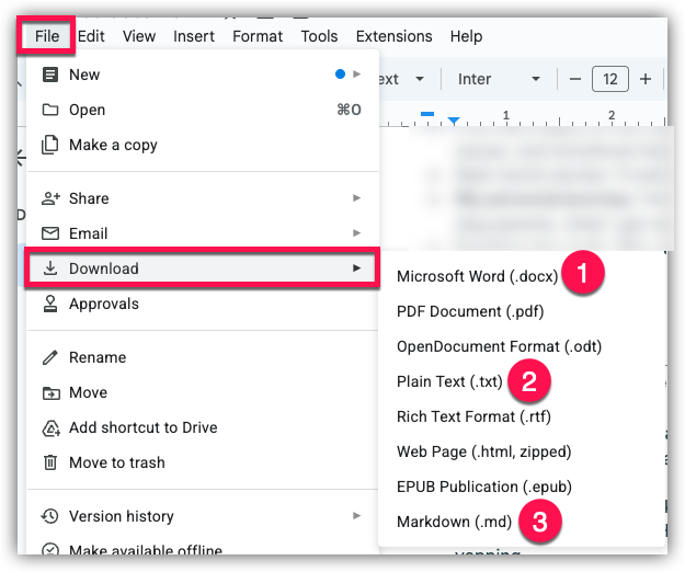 A: If you don't have the ability to or are unsure how to turn your outline into a compatible document on your device, no worries - we can help! We recommend copying your outline and pasting the outline into a Google Doc. You can create a Google Doc for free as long as you have a free Gmail account! Simply open up Google Docs and paste your outline into a blank document. Then, click on File in the top left corner, the Download, and select either Microsoft Word .docx (1), Plain Text .txt (2), or Markdown .md (3). This will save a document with your outline that you can upload to Typeset!