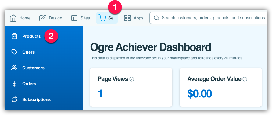Navigate to the Sell tab (1) within your marketplace. This is where you manage all your products and sales pages. Select the Products tab (2) in the left navigation side bar.