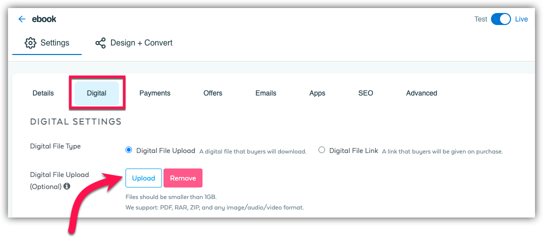 Click the Upload button to browse your computer and select the eBook file you want to sell and your file will upload to your SamCart product.