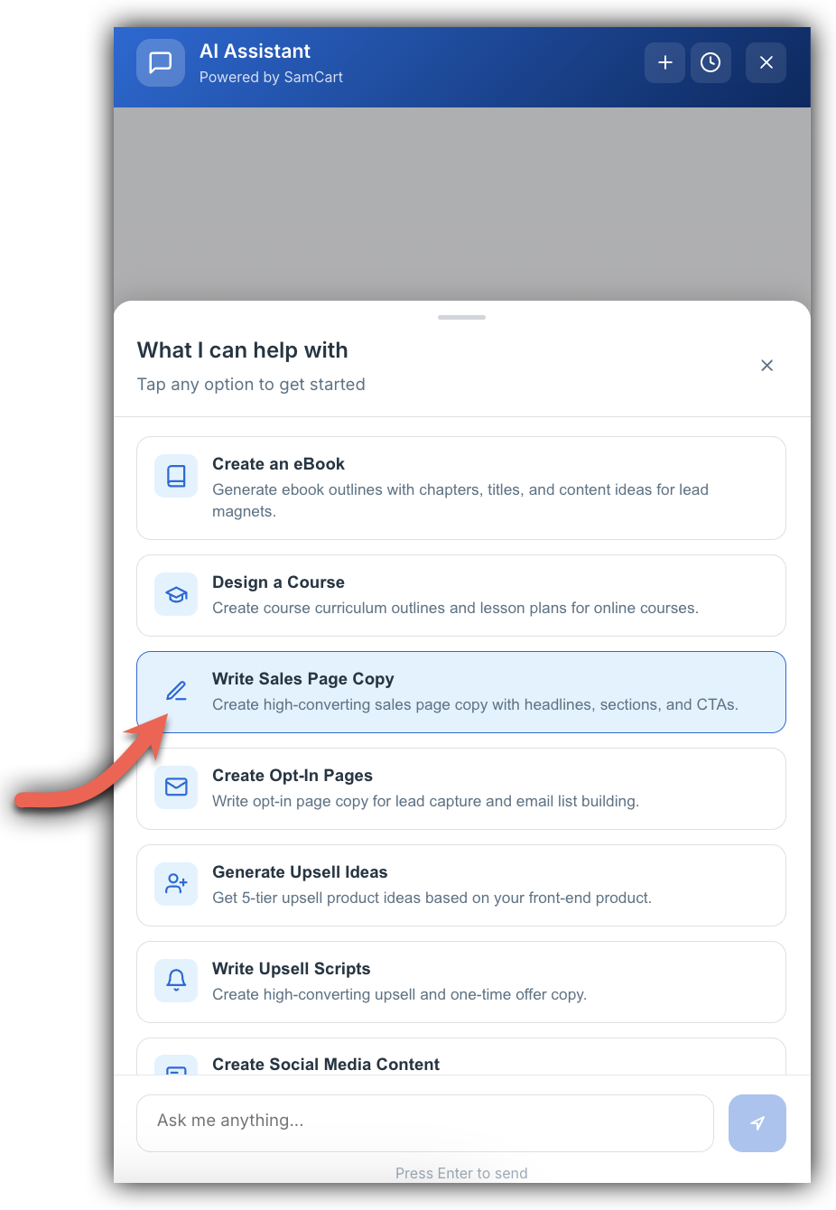 In the panel that appears, click See what I can do, then select Write Sales Page Copy.