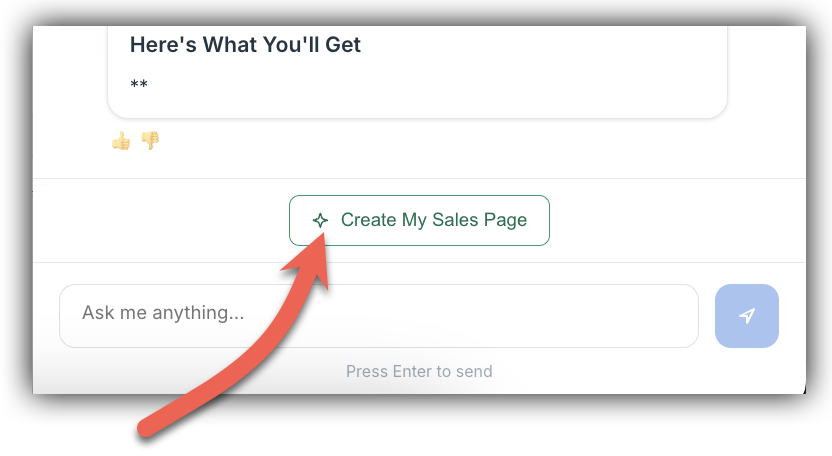 The CreatorAI Assistant will prompt you for details about your product. Fill in the fields and click Send (or press Enter) to generate your copy. Once the AI Assistant finishes generating your sales page copy, a Create Page button will appear directly in the results.