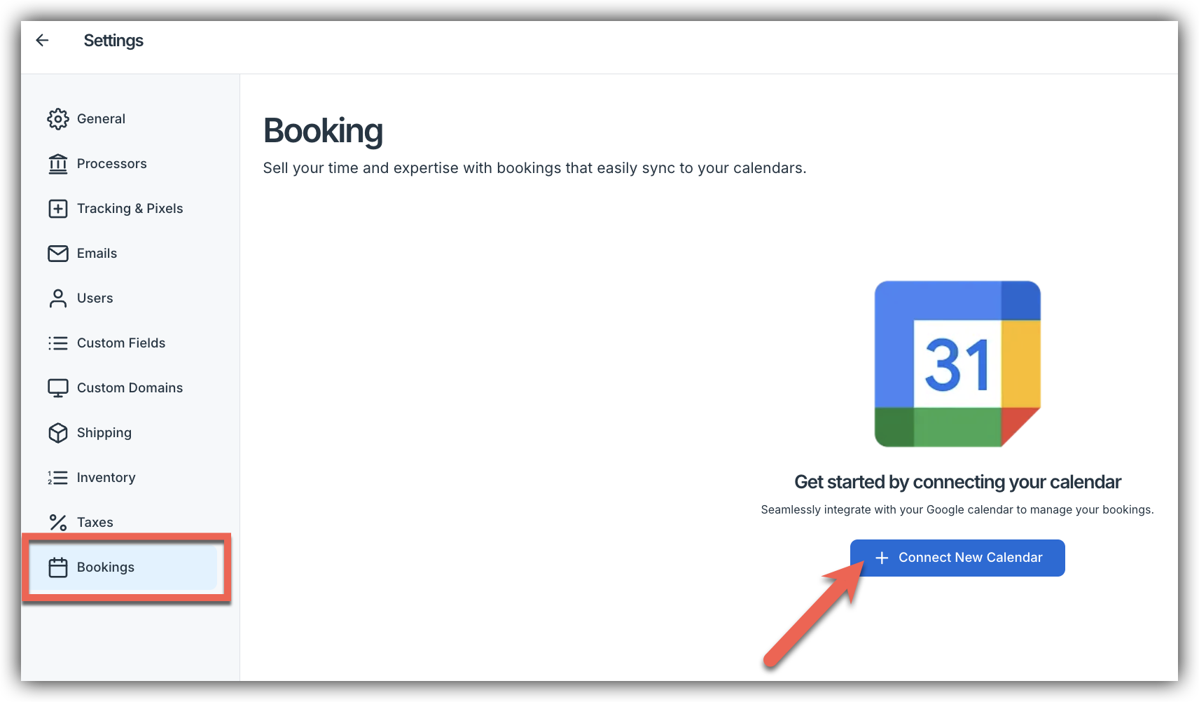 Navigate to Marketplace Settings > Bookings and click Connect New Calendar.
